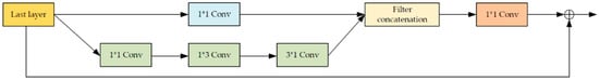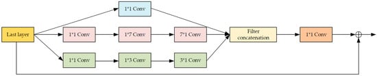 - Inception module: Three inception-residual blocks were connected in series to compose the inception modules for the noisy image feature extraction. The inception module uses feature maps from the pre-processing module as input and processes them using receptive fields with different sizes. It guarantees that the image features with multiple scales can be preserved as much as possible, because the inception structure consists of convolution layers with different kernel sizes.