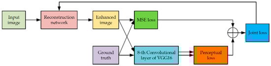 The flow of obtaining the joint loss and optimizing the network with it is shown in Figure 9. Both the pixel-wise differences and the structure perceptual differences between the reconstructed image and the ground truth image are taken into account to optimize the parameters of the reconstruction network. By minimizing the joint loss, the network learns the differences at the pixel and semantical level simultaneously, which enables the reconstruction network to retain more details and edge information while de-noising and achieving super-resolution, and finally produces clearer reconstruction images.