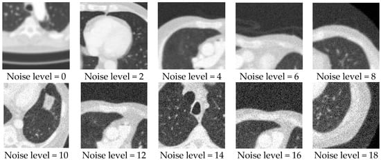 - Dataset for the degradation estimation network: In total, 42,000 image patches with the size of 100 × 100 were randomly cropped from the 1600 lung CT images. One integer was randomly generated within a variation range of 0 to 18 and used as the variance of the Gaussian noise added to every image patch. Note that we treated each image patch with random noise as an individual noisy image and the variances of different additive noise were used as the labels of the images for classification. As a result, we obtained 42,000 degraded images with the size of 100 × 100, of which 40,000 were used as the training set and 2000 were used as the testing set. Figure 10 shows some sampled degraded image patches with different noise levels. The noise level equals the variance of the Gaussian noise added to the image patch. For example, noise level 8 means the variance of the Gaussian noise added to the image patch is 8.