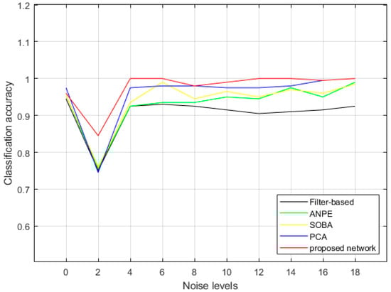 To further evaluate the performance of the proposed method, Table 2 illustrates the confusion matrix, precision, and recall of the classification of different noise levels with the proposed method explicitly. In the cases of category 1 and 2, which correspond to a relatively low noise level, the proposed method provides precision values of 0.86 and 0.955, recall values of 0.96 and 0.84, and F1-measure values of 0.91 and 0.89, respectively. It is because the noise features are not obvious enough when there is little noise, and it is easy to confuse the noise level of category 1 and 2. However, when the noise level increases, the noise features get more obvious, so the proposed method, with the ability to differentiate noisy images with different visual features, can retain high precision and recall values. The performance is especially good in the case of noise level 4 and 18, with precision, recall, and F1-measure values of 1.00, 1.00, and 1.00, respectively. One reason for this phenomenon is that noise level 4 and 18 are two watersheds between “very little noise”, “some noise”, and “much noise”, which are obviously different from their adjacent noise levels from human perception and their features can be extracted and recognized well by the proposed network. Another reason for this is that the amount of testing samples is relatively small. We will implement the network on a larger database in the future. Moreover, the errors are distributed close to the correct noise level, which means the error only occurs when the noise levels are quite close to each other.