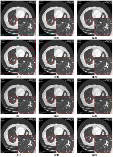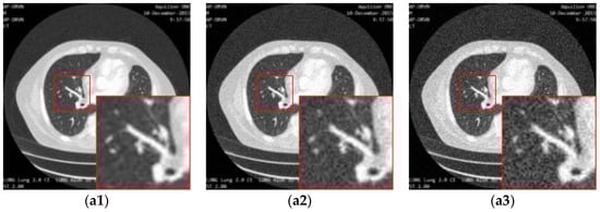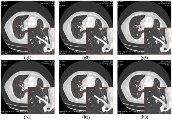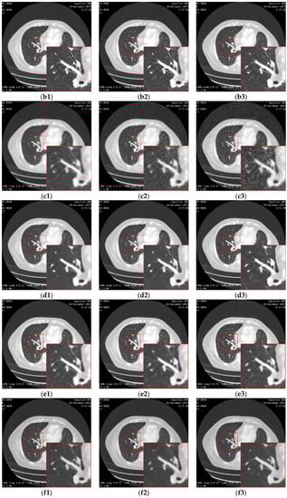 Figure 14 shows the result of enhancing the quality of images corrupted by noise and low-resolution through different methods. The bicubic interpolation method provides the worst performance, with much remaining noise and artifacts along the edges in the high-resolution image. This is mainly because the bicubic method simply makes use of the intensities in the neighborhood without taking the structure information into account. When the noise is distributed around the image, the noise intensities are also calculated by the interpolation function in the high-resolution image, resulting in the artifacts and blurring as shown in Figure 14(c1–c3). The deep learning methods perform better than the classic interpolation method because they make use of the visual features of the image so that the noise can be eliminated. However, the SRMD needs to know the noise level as prior knowledge. When the actual noise is different from the assumed noise, the performance is not as convincing. In our experiment, the noise level is unknown and was set by the user blindly, so it can be considered in Figure 14(d1–d3) that the structures, edges, or other details are not reconstructed in the resulted image. As shown in Figure 14(e1–e3), the SRCGAN can recover the structures in the medical image well, but some noise cannot be eliminated well because the GAN may consider this noise as tiny structures by mistake. In contrast, as shown in Figure 14(f1–f3), the RED-CNN can provide a good performance in the removal of noise because the U-net structure can filter out the noise features very well. However, it will over-smooth small edges in the image because it lacks the ability to preserve detailed information and perceptual features. As shown in Figure 14(g1–g3), the RDN method performs better than the previous methods because the residual-dense block can extract and reuse the image features better than the simple convolution layer used in the SRMD, SRCGAN, and RED-CNN. However, noise remains in the high-resolution image due to the ability of the skip connection to transfer noise features to the last fully connection layer as well as the structure features. Moreover, the RDN also needs to have prior knowledge of the noise level in the image, which makes it unable to adapt to a blind case. Our proposed method takes advantage of the RDN method and improves it by embedding an inception block into the skip connection routines. Moreover, it makes use of the noise estimation network to automatically calculate the noise level and takes that as the input of the quality enhancement network. Therefore, as shown in Figure 14(h1–h3), the proposed framework provides superior performance on noise removal and detail preservation during the super-resolution.