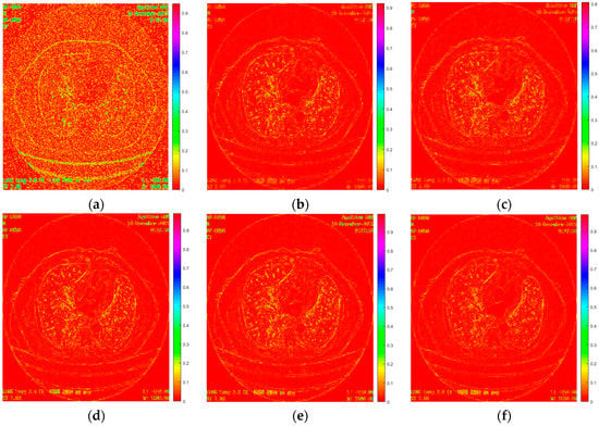 Figure 12 shows the accuracy curves of the classification of noisy image patches into different noise levels with different estimation methods. Table 1 shows the confusion rates of the confusion matrices generated by these estimation methods. All methods illustrate their capabilities to estimate the noise level with reasonable accuracies. However, the filter-based method [37] provides poor performance when the noise level is high. Additionally, the high confusion rate (0.25) of the filter-based method shows that it is likely that it recognizes the very high-level noise as “structures” by mistake. Compared with the filter-based method, the ANPE [38] and SOBA [39] can improve noise estimation accuracy, especially when the noise level is high. However, the estimation error still gradually increases while the noise level increases. Additionally, the confusion rate of the high-level noise estimation shows an unstable trend. The PCA-based method [40] is better than the previous methods in noise estimation. However, it pays the price of under-estimating the noise level; that is, it classifies the low-level noise as little noise but edge textures in the image, resulting in high confusion rates for the low-level noise. The proposed method can extract noise information on the basis of the whole image, so the estimation of noise level is more accurate with lower confusion rates.