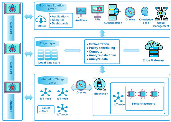 - IoT layer: This layer is integrated by IoT devices such as sensors, actuators, controllers that are used to monitor equipment in operation, services or human activities. The layer uses a wireless standard such as Wi-Fi or ZigBee [53]. The creators of GECA incorporate blockchain technology and the concept of oracles in this layer. The oracles are responsible for verifying and sending data to the blockchain and work as intermediaries between the blockchain and the devices that generate data sets with values for temperature, humidity, market prices, payments, heart rate, movement, solar radiation and more. The generated data are regulated by microcontrollers with few computer resources and reduced storage capacity and must be sent to the Edge layer, which has computing modules with filtering and pre-processing capabilities. Thanks to the Crypto-IoT boards developed by the BISITE Research Group of the University of Salamanca (Spain), this layer complements the security of the architecture. Each board is formed by a USB module in host mode for connection to micro servers such as Raspberry Pi or neural processing modules, I2C sensors in plug and play modes, an ATSHA204A encryption chip with SHA-256 technology and XBee technology to support different telecommunication standards such as: ZigBee, Wi-Fi, LoRa, FM Radio, RPMA or Bluetooth [52]. Thanks to these data-agnostic electronic devices, it is possible to implement platforms and systems in which the integrity of the data collected by the different sensors is guaranteed following the blockchained IoT paradigm. This ensures that no data are modified by any other element of the network or that spurious data are injected into it. In this way, neither the origin nor the value of the data can be repudiated by any other observer component of the data. For these reasons, it is possible to implement smart contracts that are automatically executed if the agreed conditions are met and in which the nodes that sign these contracts cannot repudiate their compliance [54].