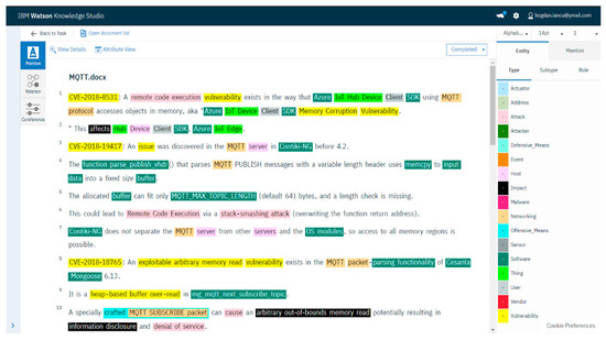 - IBM (International Business Machines). IBM Cloud. Available online: https://console.bluemix.net/docs/services/knowledge-studio/index.html#wks_overview_full (accessed on 9 January 2019).