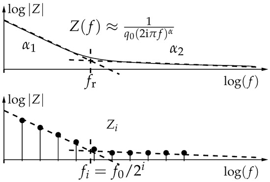Bioimpedance modeling by constant phase elements (cpe). Two domains and the transition (relaxation) frequency are highlighted (top). Logarithmic sampling of the bioimpedance measurements for parameter estimation (bottom).