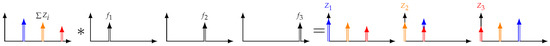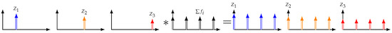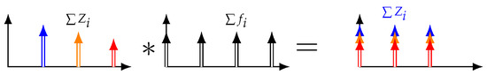 The second case is summarized in Figure 4 where analysis is performed by multiplying the multi-frequency voltage signal by pure sine values, then low-pass filtering. In the frequency domain, it consists of convoluting the acquired signal by a unique Dirac, then estimating the dc content. In this case, the signal still must be acquired for at least the inverse of the lowest frequency, i.e., ), but only one time.