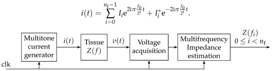 The chosen principle of bioimpedance sensing is illustrated in Figure 6. With the above considerations, generated current can be expressed as the superposition of sine waves. Current being real, hermitian symmetry applies to complex amplitudes () such that