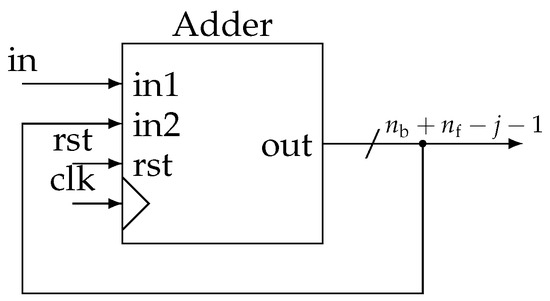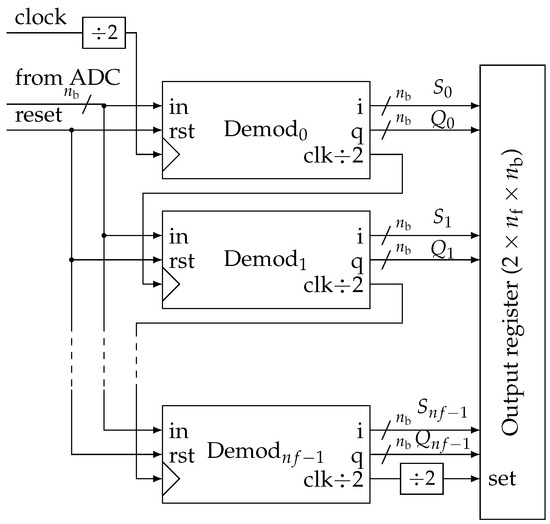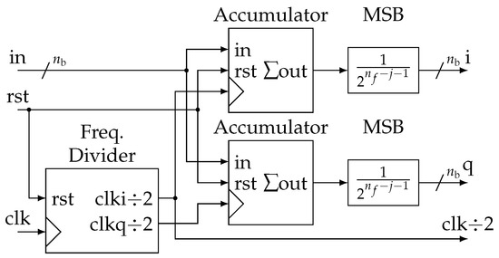 Practically, these functions are grouped in a block called Demod for demodulator that can be easily instantiated from a generic description (Figure 8). In more detail, at each stage, we generate two clock signals in quadrature (Figure 9). They control two identical accumulators (Figure 10). Samples are accumulated at the rate corresponding to a particular frequency . The adder size is adapted to avoid overflow. Then, dividing by is done by keeping only the most significant bits (msb). Thus, all and accumulation are eventually encoded with the same precision.