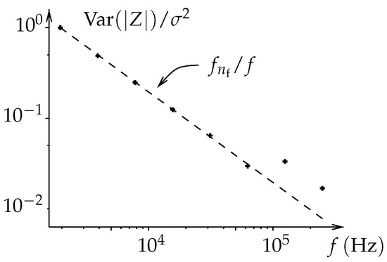 Variance of the impedance measurements exhibiting evolution. The variance is numerically estimated over 1000 random trials where gaussian noise has been added to adc datas. Variance is normalized by noise power ().