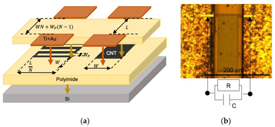 The first step was to spin-coat and cure, at 200 °C for 30 min and at 375 °C for 60 min, a 3 µm-thick polyimide surface (HD4104, HD MicroSystemsTM) on top of a bare silicon wafer. 1 µm length multiwalled carbon nanotubes functionalized with carboxyl groups (MWCNTs) were then mixed in an NMP (1-Methyl-2-pyrrolidinone, SIGMA-ALDRICH®, Oakville, ON, Canada) solvent following a ratio of 0.1 mg/mL. The MWCNTs were dispersed in the solution by sonication for 20 min. The resulting solution was spray-coated on top of the polyimide surface, which was placed on a hot plate at 220 °C in order to evaporate the NMP solvent. The MWCNT layer was then patterned using UV-photolithography and oxygen plasma etching techniques. The two geometries allow investigation of the length/width ratio effects, as defined in Figure 1a. The length/width ratio varies from 0.01 to 50. The serpentine geometry is used to optimize space, where represents the number of serpentine meanders and the polyimide width between lines. Moreover, the thicknesses can vary from 400 nm to 800 nm. A top polyimide layer was added to protect the MWCNTs. The coplanar electrodes, which consist of a first 750 nm thick titanium bottom layer and a 150 nm thick gold top layer to avoid the oxidation of titanium, were deposited by e-beam evaporation and patterned by a lift-off step.