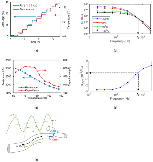 To sum up, at low frequencies equivalent to decreases with the temperature increase, whereas at intermediate frequencies proportional to increases, so the temperature coefficient of is negative for low frequencies and positive for intermediate frequencies. This means that there is a frequency where is temperature-invariant. Thus, as shown in Figure 2d, there is an intersection frequency where the two impedance magnitudes of different temperatures and intersect. The intersection frequency value can be calculated by the formula defined in Equations (4) and (5). An approximation of this frequency is defined in Equation (6), using the asymptotic frequency behaviour of |Z|. The temperature-invariant frequency () is the mean of the intersection frequencies. As shown in Figure 2e, is the frequency where the relative sensitivity to temperature is null (Equation (2)).