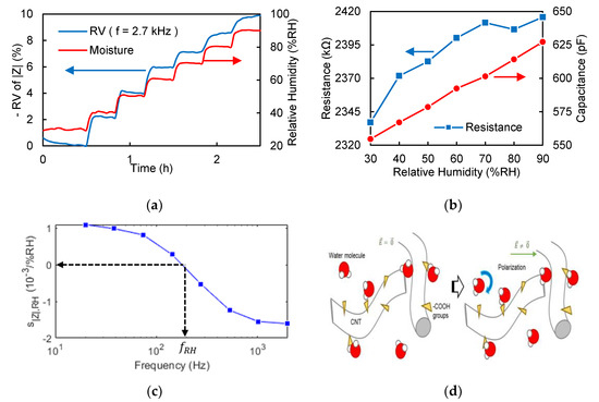 Furthermore, water molecules are able to bind with carboxyl groups present at the MWCNT surface, inhibiting the ion conduction through carboxyl groups and explaining an increase in resistance. As water molecules are polarized, they are oriented under the alternating electrical field (). The sensing mechanism is shown in Figure 3d. Hence, the increase in the number of water molecules present in the sensing material amplifies the dielectric permittivity and the capacitance (Equation (1)).