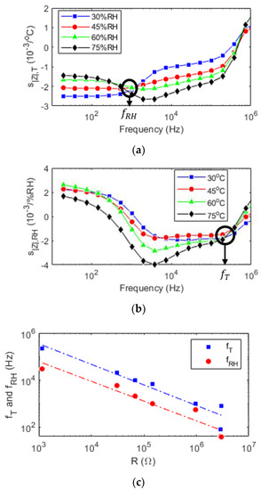 Similarly, the frequency behaviour of the relative impedance magnitude sensitivity to moisture is represented in Figure 4b for different temperatures. The curves intersect at the temperature-invariant frequency ( in Figure 4b. Thus, at this frequency, only responds to moisture, and its sensitivity is non-zero, so the moisture response can be decoupled from the temperature response at the temperature-invariant frequency.