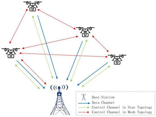 In wireless communication systems, there are usually two kinds of channels: control channel and data channel. A typical UAV cluster communication topology is shown in Figure 1. Due to the relative motion between UAVs, multi-UAVs will constitute a fluid topology, which will lead to the instability of inter-UAV communication. Usually, if UAVs collect a large amount of data to transmit, such as high-resolution video, they mainly rely on A2G links and use the star network topology. The blue straight lines in the figure show the video data link, and the video captured by each UAV is sent directly to the base station.