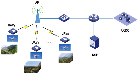 The development of various wireless technologies has greatly expanded the application of UAVs. For example, the Massive Multiple-Input Multiple-Output (MIMO) technology used in 5G network breaks the limitations of traditional 2D-MIMO and increases the vertical dimension, which is more suitable for the three-dimensional nature of UAVs. At present, people have completed the UAV flight communication tests based on the 5G network for many times and achieved High-Definition (HD) live videos’ broadcasting. Not only 5G cellular networks, but also many other wireless technologies could provide UAVs with favorable communication environments [38]. Without loss of generality, in this paper, we suppose several UAVs, as a cluster, are flying in the area covered by a customized network. They perform the tasks of acquiring and uploading videos. Figure 2 shows a typical scenario that needs to be discussed in this paper. There are N UAVs in the network. Suppose they are all in the same coverage area of a wireless Access Point (AP), which belongs to a certain Network Service Provider (NSP).