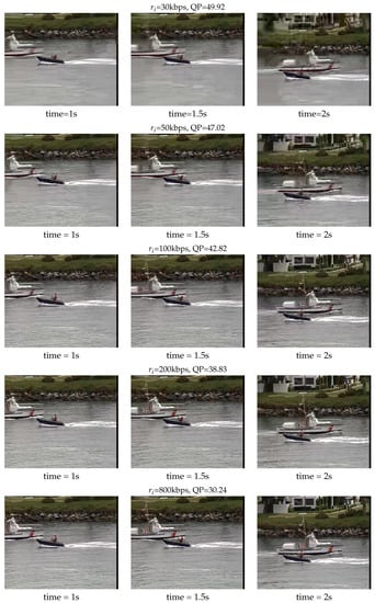 When the same video is compressed and encoded in different rates, it will bring users different viewing experiences. In order to validate this effect, we first use FFmpeg codec to encode the CIF video Coastguard into H.265 files. The original video’s format is yuv420p, 352 × 288, and the frame rate is 30 fps. After the encoding, at the time 1 s, 1.5 s and 2 s, the compressed video frames are extracted for comparison, and the results are shown in Figure 3. The encoding rate is selected within the range shown in Table 1 and the corresponding Quantizer Parameter (QP) is also listed. When the encoding rate is low, the image is relatively fuzzy, the block effect is very obvious, and the experience quality is extremely bad. As the speed increases, the clarity is improved. When the rate is greater than 200 kbps, the effect of video is more easily accepted by users. Thus, if the UAV is assigned to a different bandwidth, the onboard encoder will update the encoding rate in order to achieve the new bandwidth, which will directly affect the video’s QoE. In the following simulation, we believe that each UAV’s encoder can achieve such adaptive video encoding. That means the rate variation of the encoder can synchronize with rate allocation. After the updating, the constant encoding rate equals to the newly specified bandwidth value in each iteration. We keep on observing the total utility changes brought by the new allocation, decide whether to change the rate, and further select the best allocation method according to the distributed self-learning algorithm.
