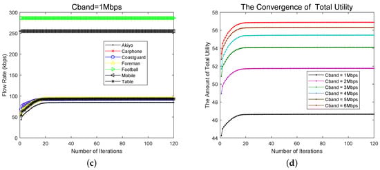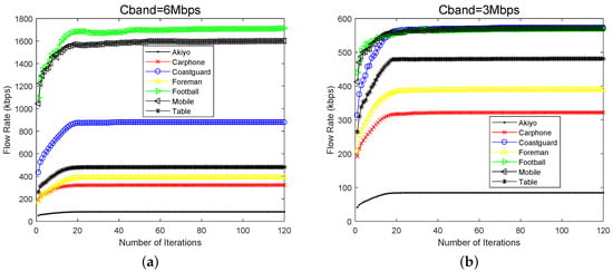 We first analyze the convergence of the algorithm. Figure 4 shows the real-time encoding rates of seven videos under three different total channel rates (1 Mbps, 3 Mbps and 6 Mbps). We can see that, after nearly 20 iterations, all curves become smooth and stable. This means that the proposed algorithm can make the system converge to equilibrium state in a very short time and obtain Nash equilibrium. When = 6 Mbps, this means that the channel bandwidth is relatively adequate. As shown in Figure 4a, each video can be encoded and transmitted at its maximum rate , and faster and more complex video naturally takes up more resources. When = 3 Mbps, the total bandwidth is limited. In Figure 4b, the videos, Mobile, Football and Costguard reduce their rates accordingly, thus keeping the total utility function within a reasonable range. When = 1 Mbps, the overall channel environment is extremely poor. In Figure 4c, Football and Mobil can only maintain the minimum rate , and the rates of the rest videos are below 100 kbps. Next, we analyze the time-varying curve of the total utility value obtained by the whole system under different channel bandwidth conditions, as shown in Figure 4d. It can be seen that, after finite iterations, the total utility value also converges to the stable value. As long as the total bandwidth provided by the AP stays the same and the characteristics of each video remain unchanged, both the data rates of all UAVs and the total utility of the system will finally remain stable. The algorithm can converge rapidly under different bandwidth conditions and has very good stability.