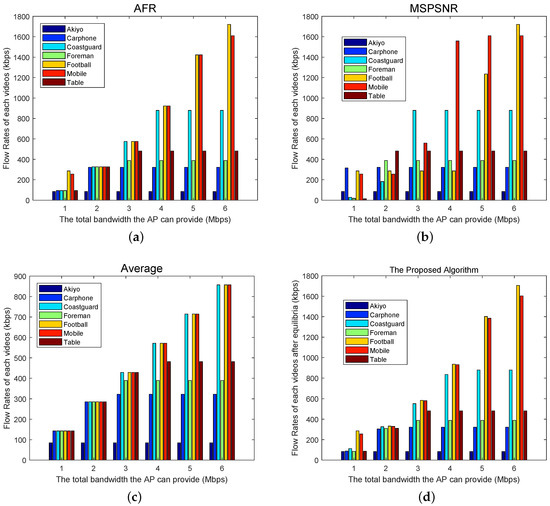 To analyze the performance of the proposed algorithm, we compare it with some resource allocation algorithms in multi-rate and multi-user scenarios, including AFR, MSPSNR [55] and Average. AFR allocates the network bandwidth as fairly as possible to each user under the condition of satisfying the minimum and not exceeding the maximum video rate demand. Under the condition of meeting the minimum rate needs, MSPSNR gives bandwidth priority to the videos with slow or medium motion or a smooth scene, in order to improve the PSNR. The average allocates bandwidth equally without exceeding the maximum user requirement, although sometimes it cannot guarantee the minimum requirement.