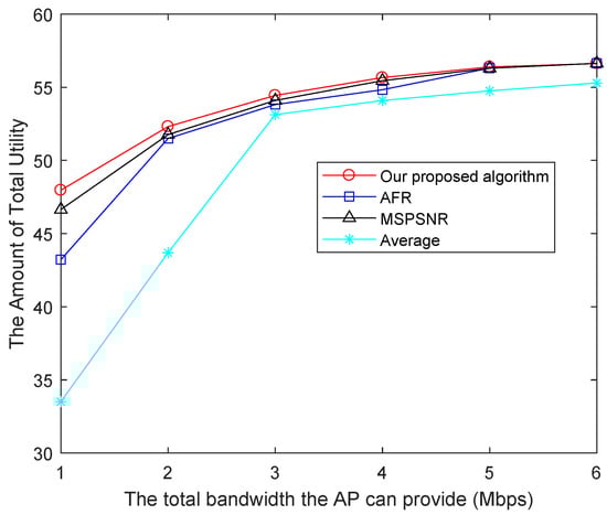 Figure 6 shows the total utility of different algorithms at different channel bandwidth. In the algorithm of this paper, a utility function of users’ QoE is designed and the problem is solved in order to maximize the utility. Thus, the total utility effects are better than other methods under different bandwidth conditions. The algorithm of Average has the worst performance because it does not consider the characteristics of videos. AFR takes the different needs of videos into account and stays fair. Its utility performance is much better than Average. Compared with AFR, the total utility of MSPSNR is properly improved.