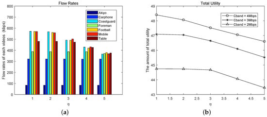 From (5) in Section 3.2, we can find that the total loss in the utility function comes from the costs of both channel leasing and energy consumption. Thus, the factor which combines the above two factors, and , can affect the results of rate allocation. When the total channel bandwidth provided by AP is 3 Mbps, we change the value of to obtain the corresponding allocation results. From Figure 7a, we can find, when becomes larger, the rates of videos with complex scene and fast motion will decrease most obviously, such as Coastguard, Football and Mobile. When , Table’s rate also begins to decrease. When the total channel bandwidth is set to 2 Mbps, 3 Mbps and 4 Mbps, respectively, we can also find this corresponding reduction in each total utility curves from Figure 7b. Therefore, from the aspect of channel leasing, the NSP can effectively control the bandwidth allocation by adjusting the price parameter . This plays an important role in differentiating the service level of multimedia users and maintaining the robustness of the whole network. On the other hand, energy consumption should also be considered in video transmission of UAVs. It is related not only to the actual video transmission rate, but also to the distance between the UAV and AP. The energy factor in the utility function could to some extent describe the different energy consumption which is caused by different transmission distances. When the distance between the UAV and AP becomes obviously far, will increase and the transmission will consume more energy, which will affect the results of the resource allocation.
