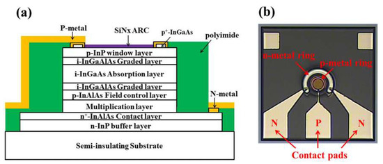 The proposed avalanche photodiode (APD) was configured using separate absorption, grading, field-control and multiplication (SAGFM) layer-structure. Table 1 details the parameters of the epitaxial layers, which were grown using molecular beam epitaxy (MBE) on semi-insulated InP wafers with (100) orientation and low etch pit density (EPD), measuring two inches in diameter and 350 μm in thickness. The quality of the epitaxial layers was verified via double-crystal X-ray diffraction (to check for lattice mismatch between hetero-junction layers less than 300 ppm), photoluminescence (to assess the optical properties of InGaAlAs, InAlAs, InGaAs and InP layers) and electrochemical capacitance-voltage (to measure the carrier concentrations of P+-InGaAs contact-layer, p-InP window-layer, i-InGaAs absorber, p-InAlAs field control-layer and n+-InAlAs contact-layer). Scanning electron microscopy (SEM) was used to measure the thickness of the epitaxial layers and characterize the interface between layers. Note that the doping concentration and thickness of the field control layer were factors of critical importance. All measurements pertaining to the epitaxial layers were confirmed by the semiconductor foundry (Intelligent Epitaxy Technology Inc., Richardson, TX, USA).