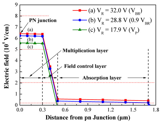In this study, the InAlAs/InGaAs APD, light absorption and carrier multiplication processes were kept separate by employing an InGaAs absorption layer with a small band gap (Eg = 0.75 eV) and a InAlAs multiplication layer with a large band gap (Eg = 1.46 eV). Two InGaAlAs graded layers were used to shift the band gap from 0.75 eV (InGaAs) to 1.35 eV (InP) and from 0.75 eV (InGaAs) to 1.46 eV (InAlAs) to assist in the transport of carriers (generated in the absorption layer) into the multiplication and window layers. The function of the p-InAlAs field control layer was to maintain a high electric field for the multiplication layer and a low electric field for the absorption layer in order to prevent high-field induced current tunneling. The InAlAs multiplication layer requires an electric field intensity of >5 × 105 V/cm to achieve carrier multiplication via impact ionization and >2 × 104 V/cm to rapidly sweep out the carriers generated in the InGaAs absorption layer (i.e., prior to recombination). This requires the optimization of electric field distribution in the absorption and multiplication layers. Typically, a SAGFM APD structure would require an electric field distribution of 5 × 105–8 × 105 V/cm in the InAlAs multiplication layer and 2 × 104–2 × 105 V/cm in the InGaAs absorption layer. Figure 2 presents the electric field profile, the calculation of which was based on the parameters of the epitaxial layer in the SAGFM APD (see Table 1), as a function of the distance from the p-n junction under various reverse bias voltages. Our results indicate that the electric field intensity profile was well controlled to the range required for the InAlAs multiplication layer (5 × 105–8 × 105 V/cm) and the InGaAs absorption layer (2 × 104–2 × 105 V/cm) when the APD was operated at a voltage of 0.9 VBR.