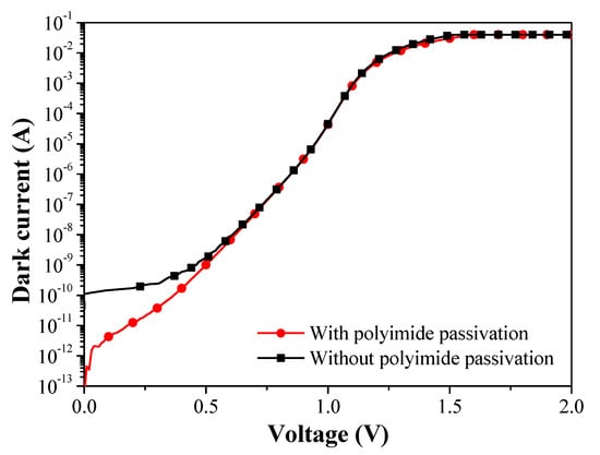Figure 3 presents dark forward I-V curves obtained from the proposed SAGFM APD before and after passivation/polyimide coating. The ideality factor (n) and reverse saturation current (J0) of the InGaAs/InAlAs SAGFM APD (as extracted from dark I-V curves) were as follows: Before passivation/coating (n = 2.79 and J0 = 3.21 × 10−7 A/cm2) and after passivation/coating (n = 1.86 and J0 = 3.55 × 10−9 A/cm2). The reduction in n and J0 values after passivation are indications of suppressed surface recombination and current leakage. The series resistance (RS) and shunt resistance (RSH) of the SAGFM APD were as follows: Before passivation/coating (RS = 11.94 Ω and RSH = 29.7 MΩ) and after passivation/coating (RS = 10.11 Ω and RSH = 34.3 MΩ). The increase in RSH demonstrates the effectiveness of sulfur and polyimide passivation when applied to a mesa-structure SAGFM APD. All diode parameters of the SAGFM APD are listed in Table 2.