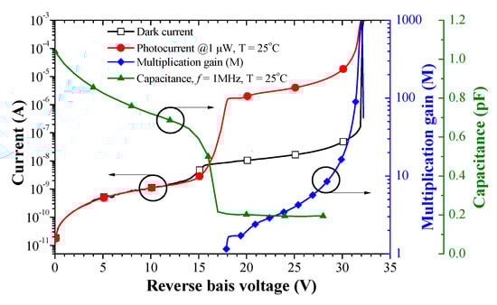 Dark current, capacitance, photocurrent and multiplication factor of InGaAs/InAlAs SAGFM APD as a function of reverse bias voltage.