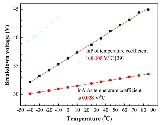 Figure 5 presents the breakdown voltage of InP-based [29] and InAlAs-based APDs (current work) as a function of operating temperature. Generally, the bias of an APD is controlled with the aim of preserving the gain of the device despite fluctuations in temperature. However, most APD devices used in optical fiber communication systems are meant to be operated at temperatures between −40 °C and 85 °C. Thus, the knowledge of how avalanche breakdown voltage changes with temperature could be useful. As shown in Figure 5, the breakdown voltage temperature coefficient (ΔVBR/ΔT) of InP-based and InAlAs-based APDs were 0.105 V/°C [29] and 0.028 V/°C, respectively. These results demonstrate that the InAlAs-based APD was less sensitive than the InP-based APD to variations in temperature.