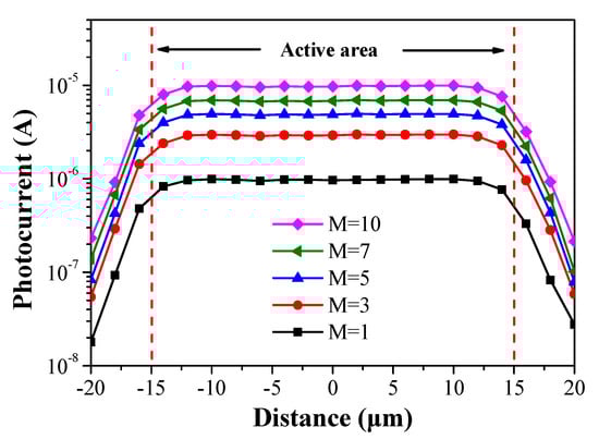 Photocurrent as a function of distance across the active area of the proposed SAGFM APD (i.e., diameter).