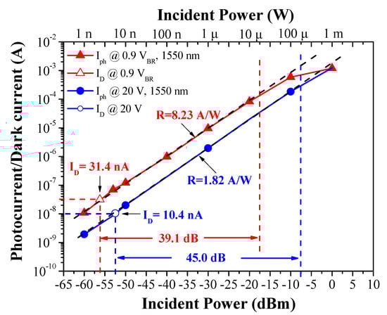Figure 7 presents the measured photocurrent as a function of incident optical power and reverse bias voltage. Incident light was delivered using a DFB laser via a lens fiber at a wavelength of 1550 nm. The black dashed lines in Figure 7 refer to APD devices operating with constant responsivity (R) across the full range of incident optical power. Here, the responsivity of 1.82 A/W and 8.23 A/W respectively refer to InGaAs/InAlAs SAGFM APDs operated at 20 V and 0.9 VBR linearly across the entire range of incident optical power. Ideally, the photocurrent values should closely match the dashed line, which would indicate that the incident optical power received by the APD covered a wide dynamic range (DR). In this study, the dynamic range of the APD device biased at 20 V (45.0 dB) was larger than that of the device biased at 0.9 VBR (39.08 dB). Under high incident optical power and high voltage biasing, the multiplication factor and photocurrent generated by the APD device were both high. The internal series resistance and external load resistance associated with high output photocurrent resulted in voltage potential on the two output terminals of APD device. This voltage potential would induce an increase in the internal shunt current with the result that the output photocurrent would be saturated by the incident optical power. In contrast, under low incident optical power, the measured output photocurrent would be limited by dark current. For the sake of clarity, we calculated the dynamic range (DR) values as follows: