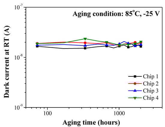 Variations in dark current measured at RT after aging. Aging conditions included reverse dark current of 100 µA at 85 °C in air atmosphere.