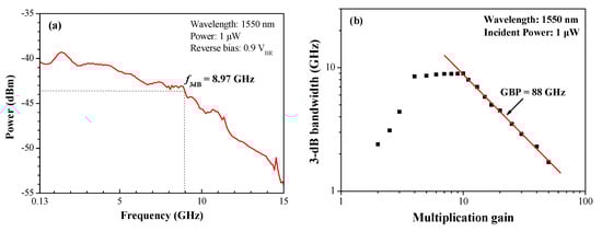 Figure 9a presents the measured frequency response (f3-dB) of the SAGFM APD under incident optical power of 1.0 μW and reverse bias voltage of 0.9 VBR, as measured under load resistance of 50 Ω using a HP 8703A lightwave component analyzer. We measured f3-dB of 8.97 GHz at the chip level, which corresponds to an operating bit rate of >10 Gbps. Figure 9b presents f3-dB as a function of multiplication gain from 2 to 50. The highest f3-dB bandwidth (approximately 9 GHz) was obtained within a multiplication gain range of 5–10. The f3-dB bandwidth increased with multiplication gain between 2 and 4, due to a reduction in capacitance associated with an increase in the depletion width of the APD under reverse bias voltage. The f3-dB bandwidth also decreased when multiplication gain exceeded 10, due to an increase in avalanche build-up time with an increase in multiplication gain. The avalanche build-up time constant increased linearly with the multiplication gain and is also proportional to the ionization coefficient ratio (k) [30]. In general, the gain-bandwidth (GB) product of APD is inversely proportional to the mean drift time of carriers within the avalanche region and is proportional to the ionization coefficient ratio [31]. Therefore, the k-ratio should be as small as possible to improve the GB-product. Overall, the gain-bandwidth product of the proposed SAGFM APD reached 88 GHz.
