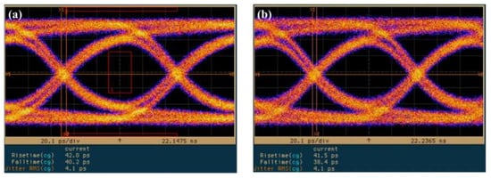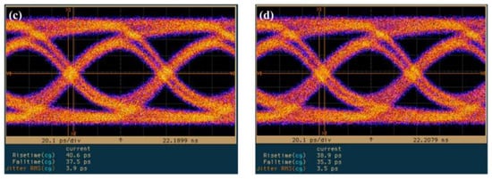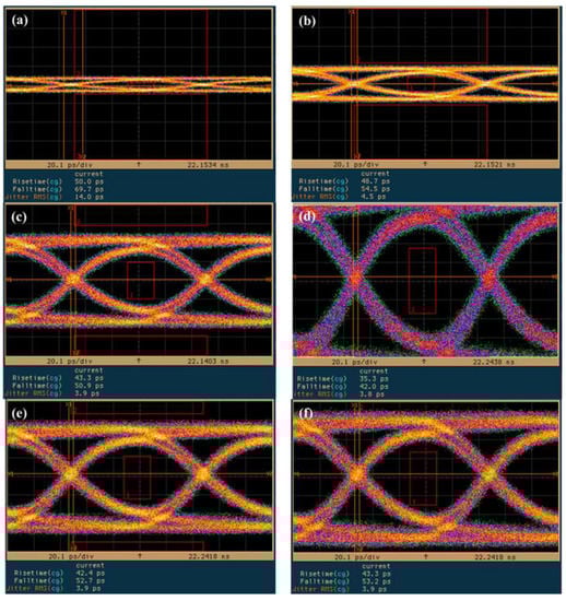 Figure 10 presents eye diagrams of the InGaAs/InAlAs SAGFM APD, under a fixed multiplication gain of 10 using nonreturn-to-zero (NRZ) pseudorandom codes with a length of 231-1, under operating speeds corresponding to bit rates of (a) 10, (b) 11, (c) 12 and (d) 12.5 Gb/s. A rise time of approximately 38.9–42.0 ps was derived from the eye-diagrams. Observe that we detected a notable absence of intersymbol-interference and the signals remained error-free at data-rates of up to 12.5 Gbps. Figure 11 presents the eye diagrams obtained from the InGaAs/InAlAs SAGFM APD operated under multiplication gains of (a) 3, (b) 5, (c) 10, (d) 20, (e) 30 with the bit rate fixed at 10 Gb/s. A 10 Gb/s built-in eye mask was used to evaluate the APD operated with a suitable multiplication gain; i.e., where the transmitted signals would be not present within the eye mask region. We determined that multiplication gains of 5 and 10 were the optimal choices. We sought to characterize the dynamic range of the AC optical power by obtaining eye diagrams of InGaAs/InAlAs SAGFM APD operated at 10 Gb/s with various incident optical powers (−17.22 dBm, −12.22 dBm, −7.22 dBm, −0.22 dBm and 0.78 dBm) at room temperature, as shown in Figure 12. Similarly, the transmitted signals should not be present within the eye mask region. This was achieved when the dynamic range of incident optical power ranged from −12.22 dBm to 0.78 dBm. Thus, the dynamic range of AC incident optical power was approximately 13 dB, which is less than that of DC incident optical power (45 dB). Table 5 lists time response and calculation of f3-dB data using values obtained from eye diagram measurements.