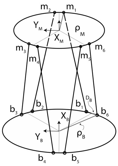 Points bi and mi are the connecting points of the legs which connect the base to the mobile plate. We select as workspace variables the relative 3D position and orientation of frame {M} with respect to frame {B}. The connecting points of the base platform b1 and b6, b2 and b3, and b4 and b5 can be considered in pairs and the orientation of each couple is defined in the frame {B} by the vector . Therefore, the locations of the connecting points of the base platform for each of the previous pairs are