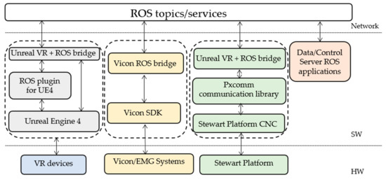 Figure 5 shows a sketch of the software layers and interfaces (depicted as solid boxes). The main hardware (HW), software (SW) and network layers are sketched within the same figure and separated by dashed lines. Each stack (dashed box) represents a different software module with its stratification and constituent software layers. As detailed above, all the software modules are provided with ROS interfaces, also referred to as ROS bridges.