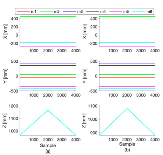 Figure 6 and Figure 7 show the Cartesian coordinates of each connecting point of the mobile platform (one color for each point mi) while performing the two tests. RMSE values of both tests (along with their standard deviations) are shown in Table 2 and Table 3. Notably, during the first test (while the platform was simply elevated from the floor), the RMSE values of all the X and Y coordinates remained 0.8 mm, exception made for the connecting points of the mobile plate m5 and m6 that are maximum 2.4 mm. The Z coordinate shows an error that goes from 1.5 to 2.3 mm. While the plate was moving according to the sinusoidal time law, the RMSE was always bigger along the Z axis, but in general increased in all axes. In order to evaluate the repeatability of the platform behavior, we also acquired three consecutive movements of the first test, and we found that the RMSE between these repetitions was 1.44 ± 0.9 mm.