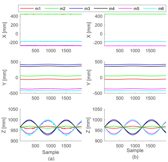 Cartesian coordinates of the connecting points of the mobile plate mi (one color each point) while the roll angle follows a sinusoidal time law. (a) Data captured by the cameras system. (b) Data reproduced by the simulation algorithm.