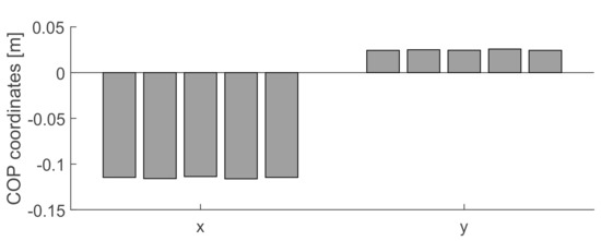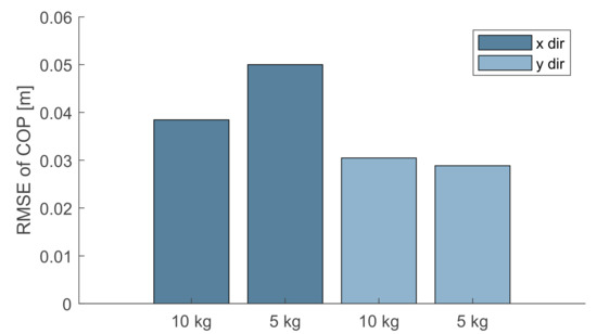 The correction of errors while measuring forces, moments and COPs was performed following the four steps of the PILS procedure [27]. In order to test the accuracy of the corrected output we performed 10 trials—each one lasting 5 s. In each of these acquisitions, we computed the COP coordinates COPCalib starting from the signal of the loading cells with the mobile platform loaded with calibrated loads of 10 kg and 5 kg, which were positioned at 10 cm from the platform center. Each test was repeated 5 times. In particular, we used the calibration matrix C given by the PILS procedure and we compared the COP values by using the RMSE of X and Y directions with the gold standard (). was estimated by the markers located on the loads and tracked by the motion capture system and expressed with respect to the platform base frame {B}. Figure 8 shows the RMSE between and COP measurements revealed a RMSE between 0.04 and 0.05 m along the X axis and of 0.03 m along the Y axis and . Darker grey bars denote the RMSE in the X direction. Light grey is the RMSE in the Y direction.