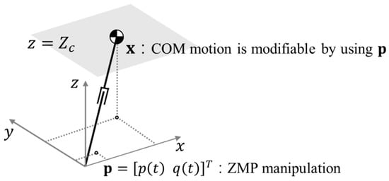 Three-dimensional (3-D) linear inverted pendulum model (LIPM) with zero moment point (ZMP) manipulation.