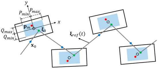 In the conventional CP tracking controllers, the initial CP and ZMP positions, and , in Equation (8) for the reference CP trajectory generation, were heuristically determined by using some offset from the center of the supporting foot or determined by a backward iteration method using information on command lists of several future footsteps [14,15,16,17]. The conventional methods are able to cope with the change at each footstep of navigational command by recalculating the backward iteration method. However, it is difficult to immediately respond to sudden change of navigational command in the single support phase by using the backward iteration method, because the method requires a sequence of future footstep commands to generate the reference CP trajectory. In the proposed method, and are set by using the real-time ZMP manipulation from the MWPG without information on future footstep commands as follows: