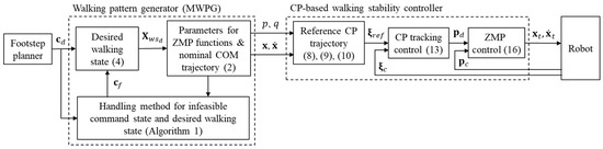 where is the current ZMP. The target COM position and the velocity, and , are calculated by adding the integration of Equation (16) to the nominal COM trajectory from (2). Consequently, they enable the ZMP while walking to follow the desired ZMP for CP tracking control.