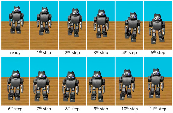 DARwIn-OP has a relatively large foot for its leg length, which makes most footstep commands feasible because of its relatively large allowable ZMP region. Therefore, in this simulation, the allowable ZMP region was intentionally reduced to = 0.3 cm, = −0.3 cm, = 0.25 cm, and = −0.15 cm to simulate infeasible command state handling.