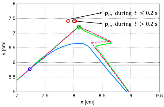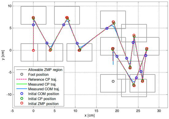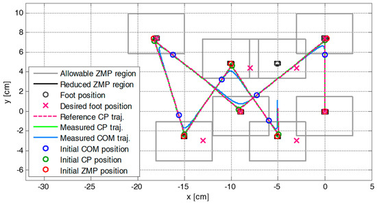 Figure 5 shows the snapshots of the first simulation result with the proposed CP-based walking stability controller, and Figure 6 illustrates the reference CP trajectory, , generated through ZMP manipulation, as well as the measured CP and COM trajectories, and , for the modifiable walking pattern in the first simulation. The initial CP position at each footstep (small green circle), , was derived from the initial nominal COM position (small blue circle) and the velocity in the single support phase. The modifiable ZMP position (small red circle), , was derived from the ZMP functions for the given footstep command, which fell within the allowable ZMP region (thin rectangle) set as = 3.0 cm, = −3.0 cm, = 2.5 cm, and = −1.5 cm.