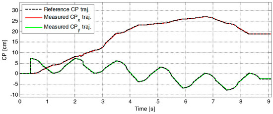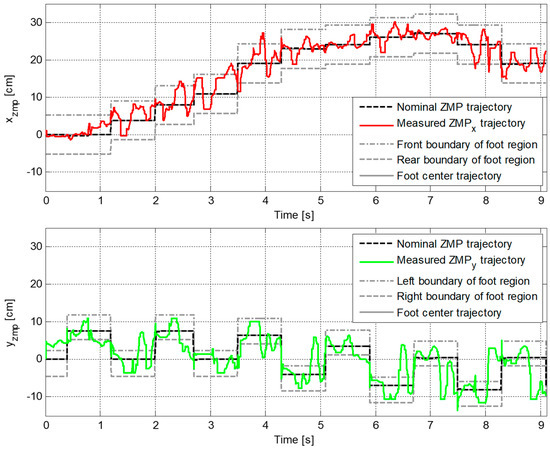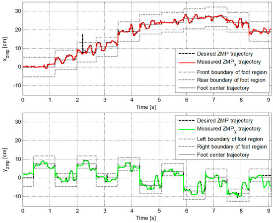 Figure 9 plots the reference and the measured CP trajectories in the x-axis and the y-axis. The real CP trajectory followed the reference trajectory with small error, as shown in Figure 10, which was facilitated by the CP tracking controller that enabled the current ZMP to follow the desired ZMP trajectory. In Figure 11, there is a peak in the desired ZMP trajectory for CP tracking control in the x-axis at . This peak was caused by the instant variation in the target CP resulting from the change in the footstep command. However, the following desired ZMP trajectory was generated normally, meaning the ZMP followed the desired trajectory continuously without being influenced by the peak. It can be seen that the ZMP was measured with a small variation from the foot center trajectory. Consequently, the real CP trajectory was able to successfully follow the reference CP trajectory for stable modifiable bipedal walking.