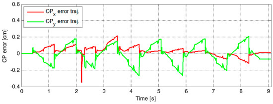 Error trajectory between reference and measured CPs, and , in the experiment with the proposed CP-based walking stability controller.