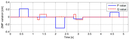 Figure 7 illustrates the variation in the parameters of the ZMP functions relative to the center of the supporting foot. The figure indicates that ZMP manipulation occurred whenever the footstep command changed. Therefore, the modifiable ZMP positions also changed through the ZMP manipulation. Specifically, the forward step length of the third footstep was modified from 8.0 cm to 3.0 cm at a time 0.2 s after the start of the single support phase of 0.4 s. The footstep command was modified in the single support phase, which resulted in ZMP manipulation. Figure 7 shows that the ZMP function for sagittal COM motion, , was modified at . For the abruptly shortened step length, the parameter of the ZMP function, , was changed, and the remaining single support time, , was modified from 0.2 s to 0.09 s. From the modified ZMP function, the modifiable ZMP position was also changed to realize the modified footstep command. Figure 8 presents an enlarged view of the area around the second footstep in Figure 6. The modifiable ZMP position for the third footstep was changed to a more forward position compared to that for the forward step length before modification. Consequently, the reference CP trajectory was modified in real-time according to the changed modifiable ZMP position. The real CP and COM trajectories were also adjusted to track the modified reference CP trajectory, as shown in Figure 8.