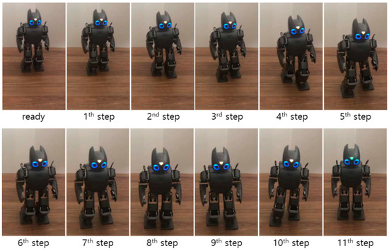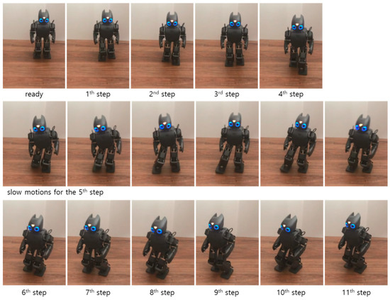 Experiments were performed using a real bipedal robot, DARwIn-OP. The same footstep commands used in the first simulation were realized for the experiment on modifiable bipedal walking. A walking experiment that did not use the walking stability controller was performed first for the comparisons with the walking experiment that used the proposed walking stability controller. Figure 14 illustrates the snapshots of the experiment result without the walking stability controller. The robot walked unstably and almost fell as it stumbled at the fifth footstep, as shown in the Figure. In this experiment, CP tracking control was not performed, meaning the desired ZMP trajectory for CP tracking control, , was not obtained. Accordingly, the measured ZMP trajectory was compared to the nominal ZMP trajectory obtained from the ZMP functions of the MWPG relative to the global coordinate system, as shown in Figure 15. The figure indicates that the measured ZMP trajectory followed the nominal ZMP trajectory with significant variation, and it was sometimes saturated. This instability was caused by the dynamic COM motion from the MWPG needed to perform the given footstep commands. Consequently, it was confirmed that a walking stability controller was required to successfully realize stable modifiable bipedal walking, including a sudden adjustment of foot placement during the single support phase.