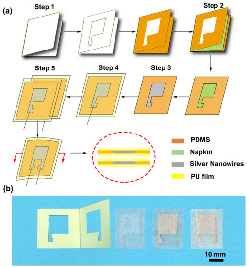 Wearable sensors have gained considerable attention in academics and industry because of their promising applications in personal healthcare [1], human-activity monitoring [2], and artificial intelligent robotics [3,4,5]. Due to their low modulus, light weight, flexibility, high sensitivity, and stretchability, wearable sensors are conformally in contact with the surface of organs or skin, which paves a new way for fitness tracking, disease diagnosis, and risk prevention by monitoring of human motions ranging from tiny physiological signals (e.g., pulse, heart rate, respiration, and phonation) to substantial movements (e.g., muscle movement) [6,7,8,9,10,11]. Different strategies have been introduced based on various detection mechanisms, such as piezoelectric, resistive, and capacitive principles, with multiscale architectures [12,13,14,15,16,17]. However, most of the methods rely on microelectronics fabrication processes and involve complex fabrication processes, such as ultraviolet exposure, oxygen-plasma, vacuum deposition of films, spin-coating, photolithography, wet and dry etching, and transfer-printing. Despite them having been proved to be effective, the high cost associated with expensive instruments and materials limits their applications. Some low-cost and highly sensitive flexible sensors were developed, however, the fabrications involved multiple steps [18,19]. It is still a challenge to develop a flexible sensor with high sensitivity in a cost-effective way through a facile manufacturing process.