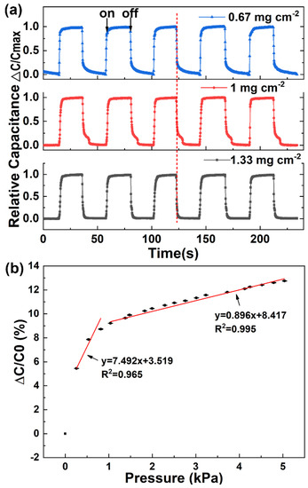 where C and C0 refer to capacitances with and without the pressure, represents the change of the applied pressure [37]. According to the definition, pressure sensitivity S expressed as the slope of the traces is usually applied to evaluate the performance of a capacitive sensor [38]. By analyzing the relative capacitances in corresponding with the applied pressure, a bilinear relationship between the relative capacitance and the applied pressure was obtained (Figure 3b). The pressure sensitivity, averaged over 3 sensors, is 7.492 kPa−1 in low-pressure regime (P < 1 kPa) and 0.896 kPa−1 at higher pressures (1 < P < 5 kPa). The high sensitivity in the low-pressure regime enables the sensor to distinguish tiny pressure signals, especially, weak physiological signal (e.g., wrist pulse, respiration). The relatively lower sensitivity at higher pressures extends the application of the sensor. It can be applied to detect gentle touch and figure motion. The high performance of the napkin-based sensor is sufficient for detection of physical signals.